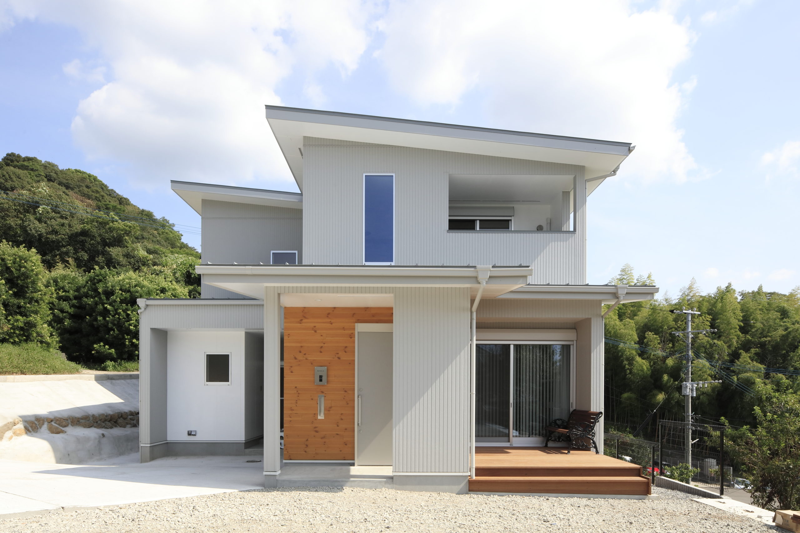 西日を遮る片流れのシャープな外観に、景色を切取る窓を配置。室内からも景色を楽しめるように配慮しました。