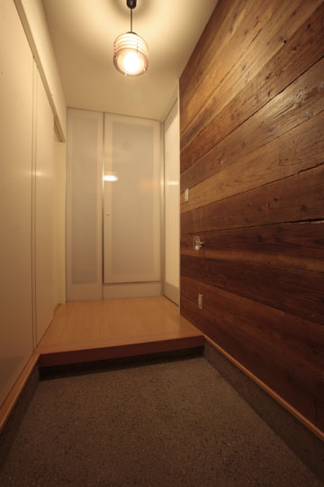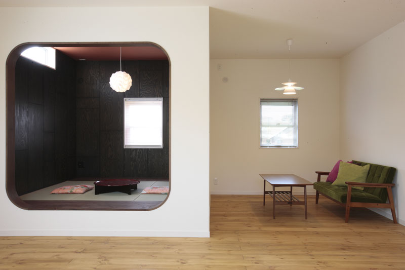 お客様は、60年代・70年代、いわゆるミッドセンチュリーを好まれ、とてもセンスの良い家具や小物をお持ちでしたので、それらを生かす為、空間自体はシンプルなものを目指しました。その中に、くつろぎのスペースとして『かまくら』(たたみ間)をご提案しました。『かまくら』内部の壁は、木目のパネルをこげ茶色に染色、天井には朱色の和紙を貼っています。まわりのインテリアとも馴染み、空間にメリハリをつけるアクセントとしても良い仕上りだと感じています。 その他、床にはパインの無垢板を使用。できるだけ素朴な風合いを目指しました。